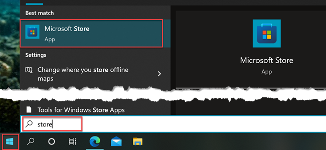 Click on the Windows Start button and type in "store", and then click on Microsoft Store in the search.