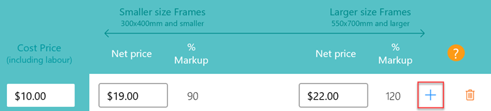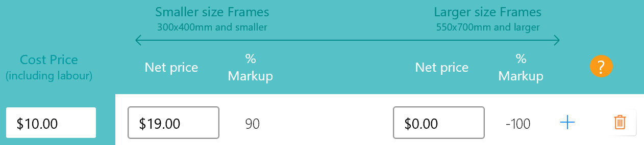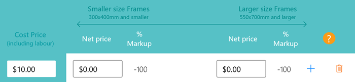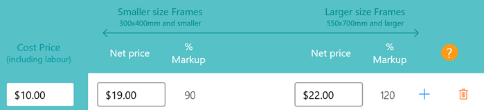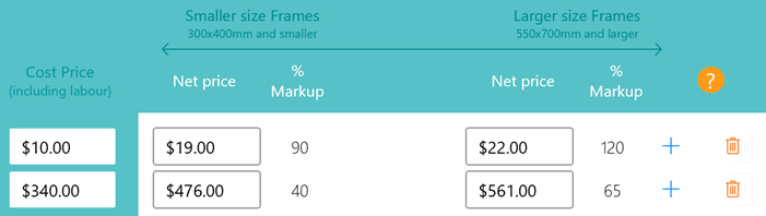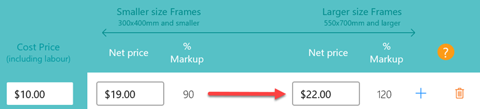 Then enter a selling price for the larger size. Again a % markup will be displayed, this is the maximum % markup to be applied to any frames 550x700 or larger. It is also the maximum % markup applied to lower cost items.