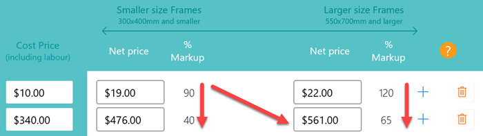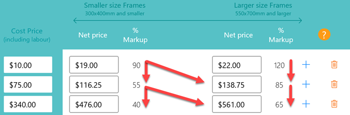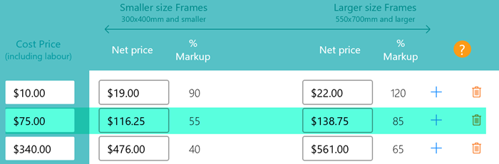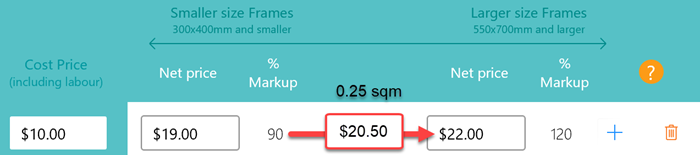 For example; we can see that a frame/material with a square metre size of 0.25sqm (around 450x550mm), half way between 0.12sqm and 0.38sqm will have a % markup of around 62% (half way between 30% and 90%) giving a net selling price of $12.96.