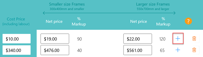 In the next column enter your preferred selling price (before sales tax, if applicable). A % markup will be displayed, this is the % markup that will be applied to any frames 300x400mm or smaller. It is also the minimum % markup that will be applied to any items that cost less than the cost price entered.
