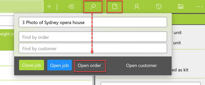 There are a number of ways to open an existing Order. From the job form you can find the order by job or order number and by customer. When you have found the correct item, click on the Open Order button. It's also possible to Open a blank Order from the Orders button.