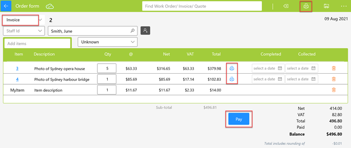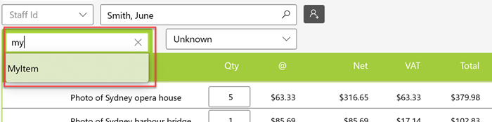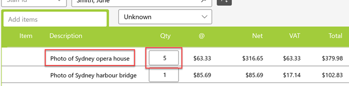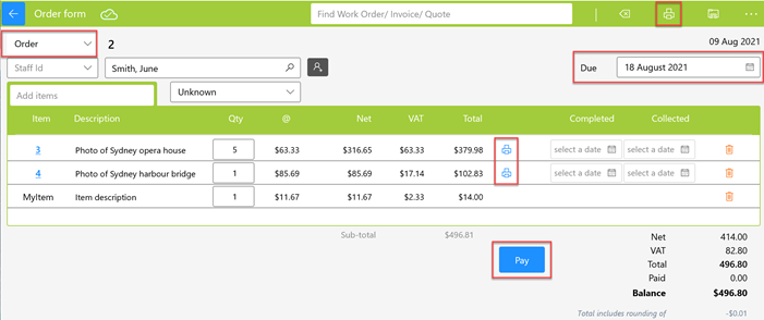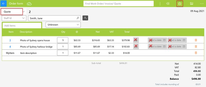 It's also possible to include Item sales to an Order. Type in the Item code or description and select it from the list to add it to the Order. Just like jobs the quantity can be increased on the order.