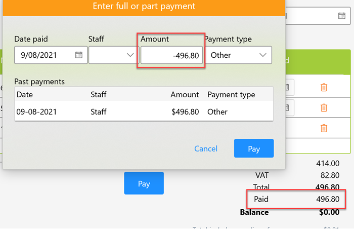 Before you can delete an order, any Payments must be reversed. To do this click on the Pay button and enter a negative payment amount for the amount that was originaly paid.
