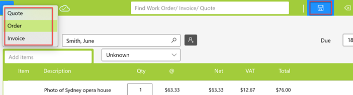 In the Order the status can be set to Quote, Order or Invoice. When changing the status, ensure that you save the change.