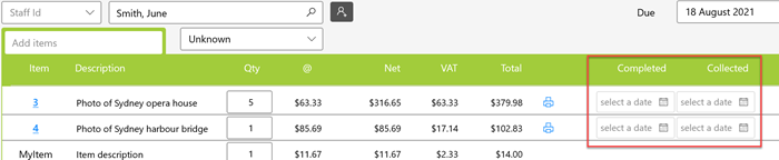 After an Order has been saved, a print icon and calendars become visible. These allow you to print a jobsheet and allow jobs on the order to be marked as completed and collected. If the customer is selected to receive an SMS completed, marking all jobs as completed and then clicking save on the top toolbar will automatically notify the customer that their jobs are ready to pick up.