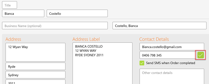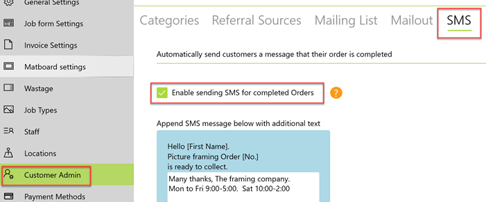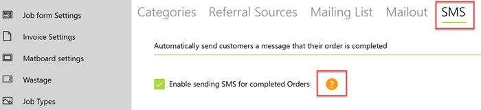 When the checkbox in settings is ticked a SMS checkbox becomes visble on the Customer form. When creating a new customer enter a mobile number and tick the checkbox below. This will now send an SMS to the customer when all jobs on a order are marked as completed.