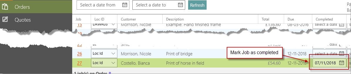 In Outstanding orders mark a job as completed.