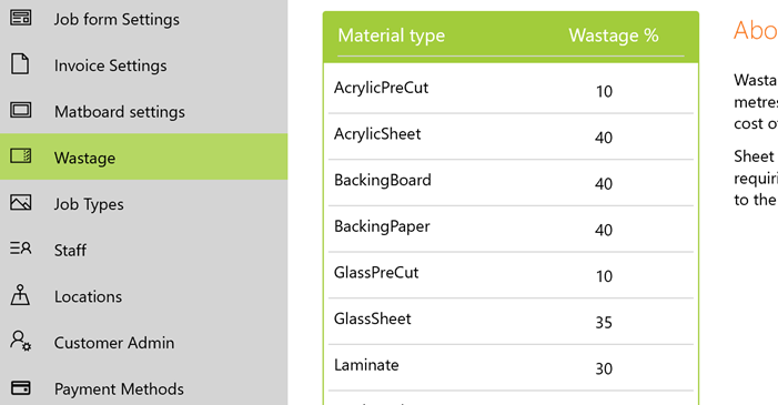 Wastage is applied as a percentage of the total material used and is applied globally to all materials of that type. Enter the percentage of wastage you deem correct for each material type.