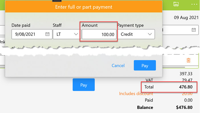 To make a payment, click the Pay button to open the payment dialog.