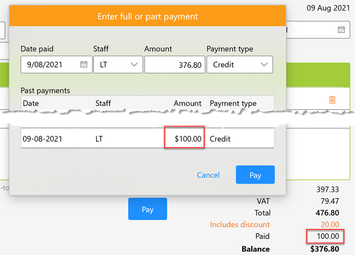 In the payment dialog, a Date, Staff Id, Amount and Payment Type can be selected.