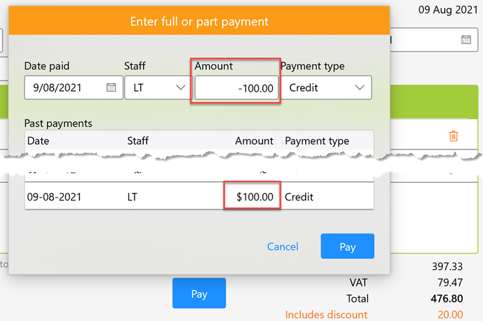 If payments need to be reversed, this can be done by entering a negative amount into the Amount box.